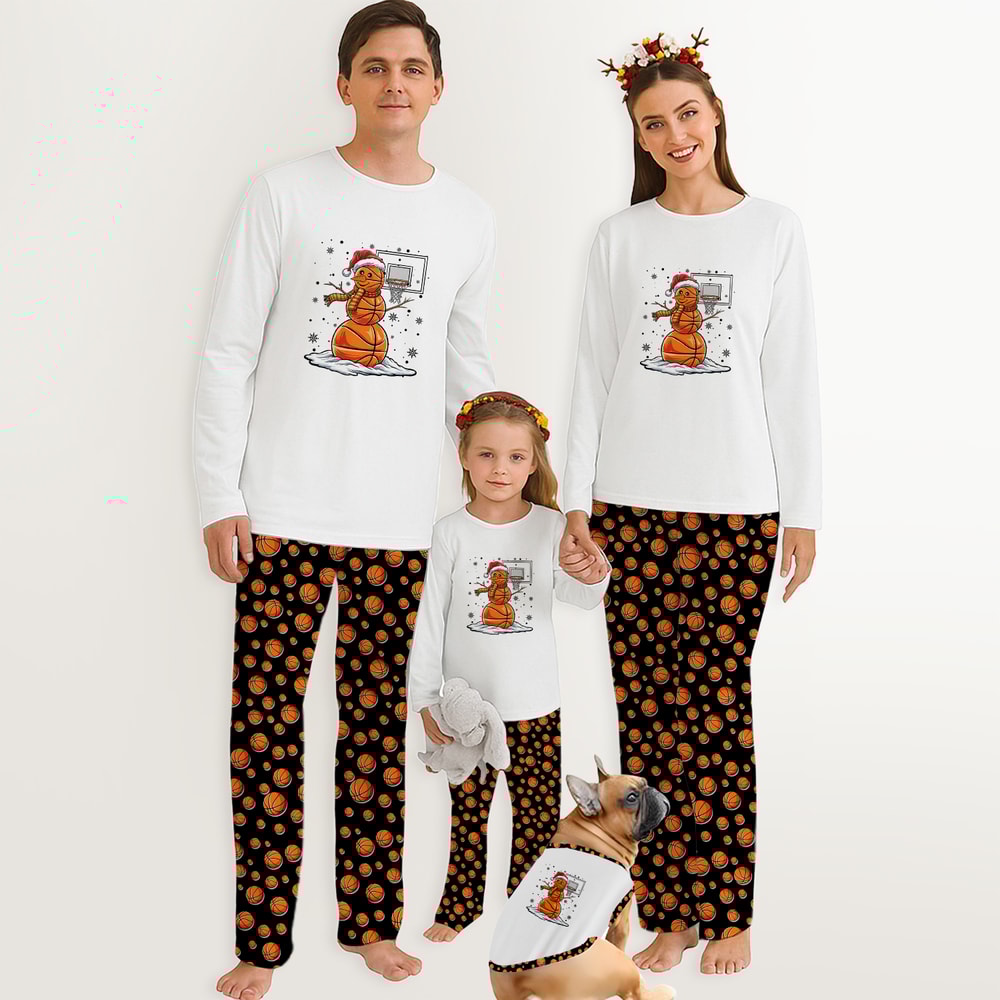 Build a slam dunk Christmas with Basketball Snowman Family Matching Pajamas! Features an adorable snowman made of basketballs on white tops paired with fun basketball print pants. Soft, stretchy fabric with 2 side pockets. Perfect for sports-loving families!