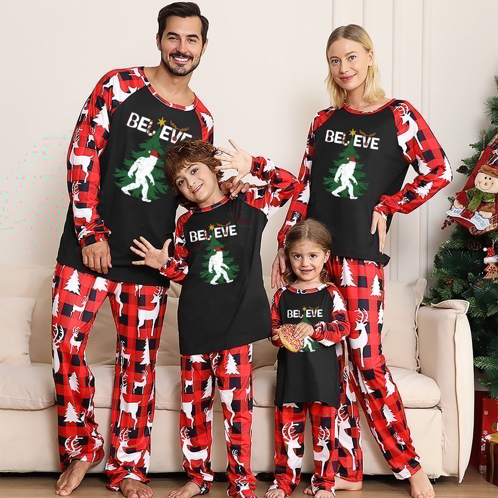 Festive Bigfoot “Believe” matching family Christmas pajamas with red plaid reindeer print. Soft, stretchy, cozy fabric - perfect for photos, parties, and magical holiday moments.