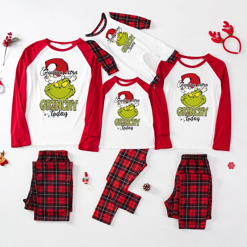 Cozy matching family Christmas pajamas featuring the “Feeling Extra Grinchy Today” design with festive red plaid accents. Perfect for holiday photos, lounging, and family celebrations.