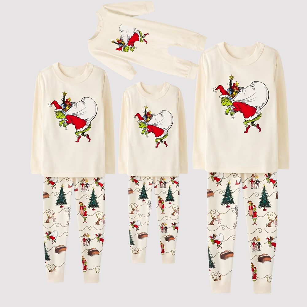Festive family matching Christmas pajamas featuring a green mischief character, holiday print pants, and a matching pet shirt. Soft, breathable, easy-care fabric for adults, kids, babies, and pets.