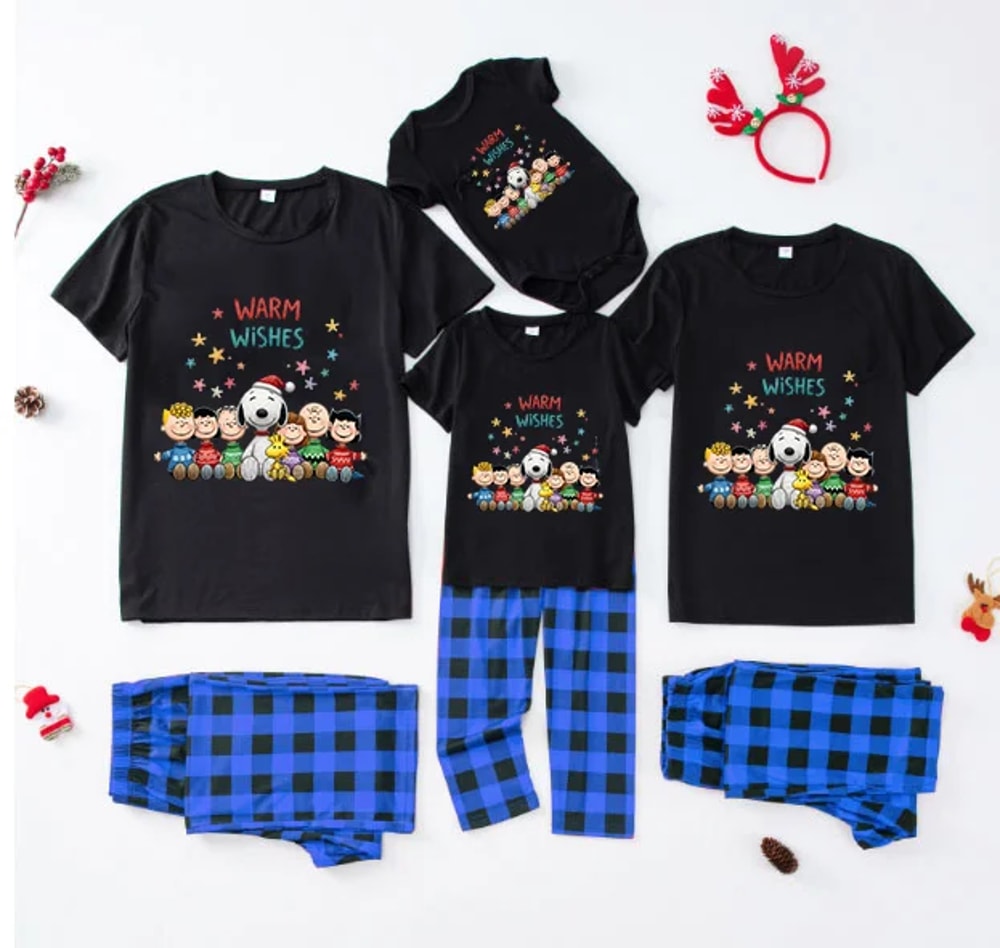 Celebrate the holidays in coordinated comfort with our Peanuts Christmas Family Matching Pajamas – Warm Wishes Holiday Nightwear Set. Featuring Snoopy and the Peanuts gang on soft, cozy tees paired with blue buffalo-plaid pants, plus a matching pet shirt so your furry friend can join the fun!
