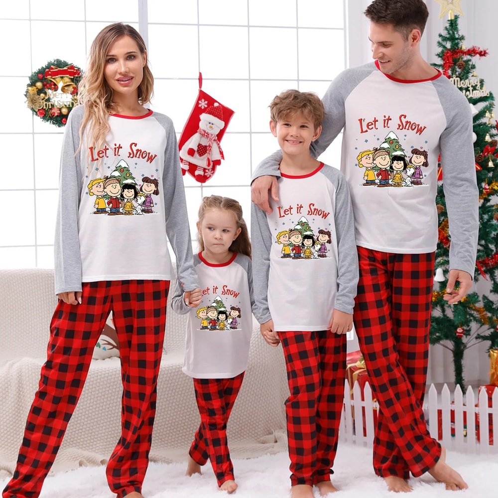 Celebrate the holidays in classic Peanuts style with these Let It Snow matching family Christmas pajamas. Featuring Charlie Brown, Snoopy, and friends in a festive winter scene with cozy red-and-black plaid pants, these comfortable PJs are perfect for photos, lounging, and creating joyful memories together.