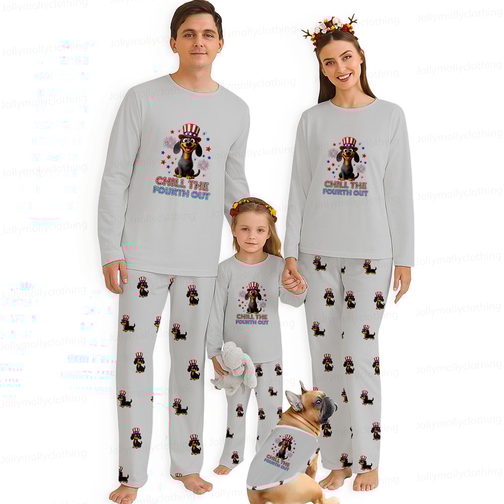 Stay cozy and festive with Chill the Fourth Out Dachshund Pajamas. Soft long sleeve family matching set, perfect for 4th of July nights, lounging, and cute family photos.