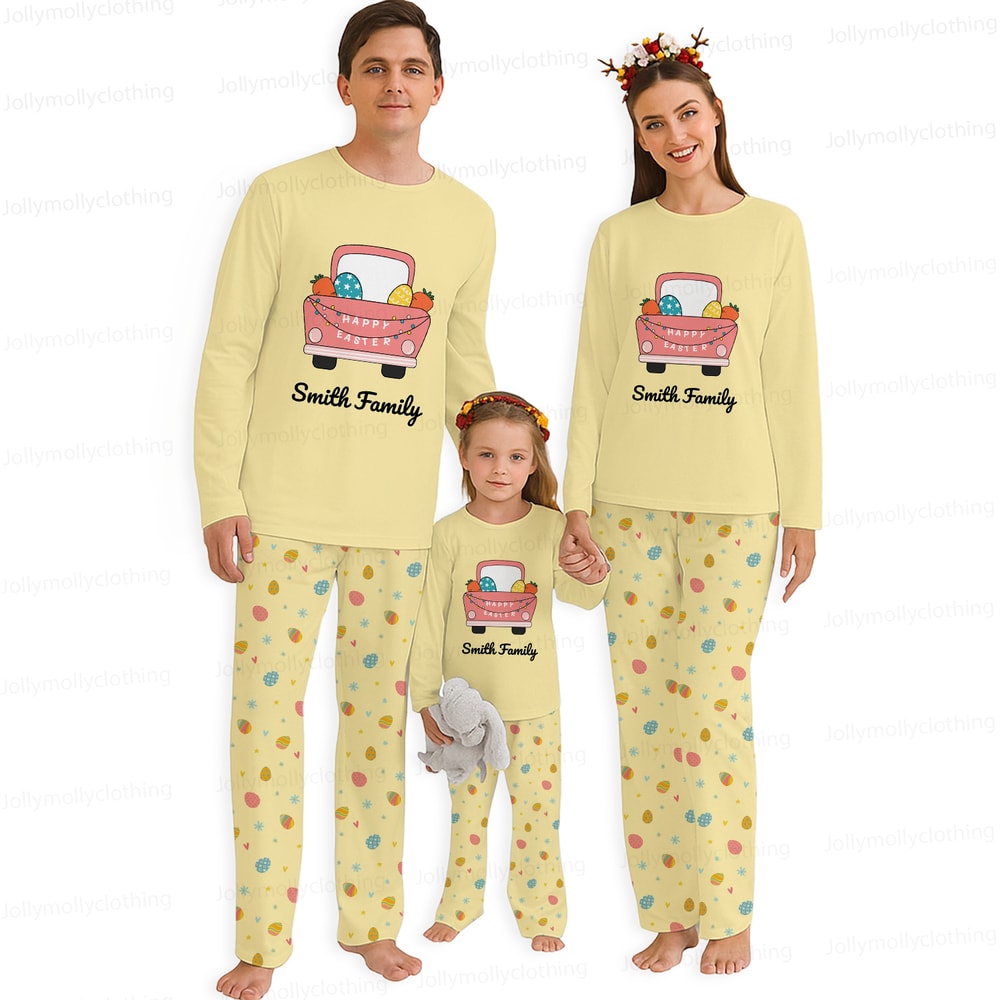 Custom name Easter truck matching family pajamas in cheerful yellow featuring long sleeve tops and festive Easter print pants. Soft poly blend sleepwear for parents and kids, perfect for spring and Easter celebrations.