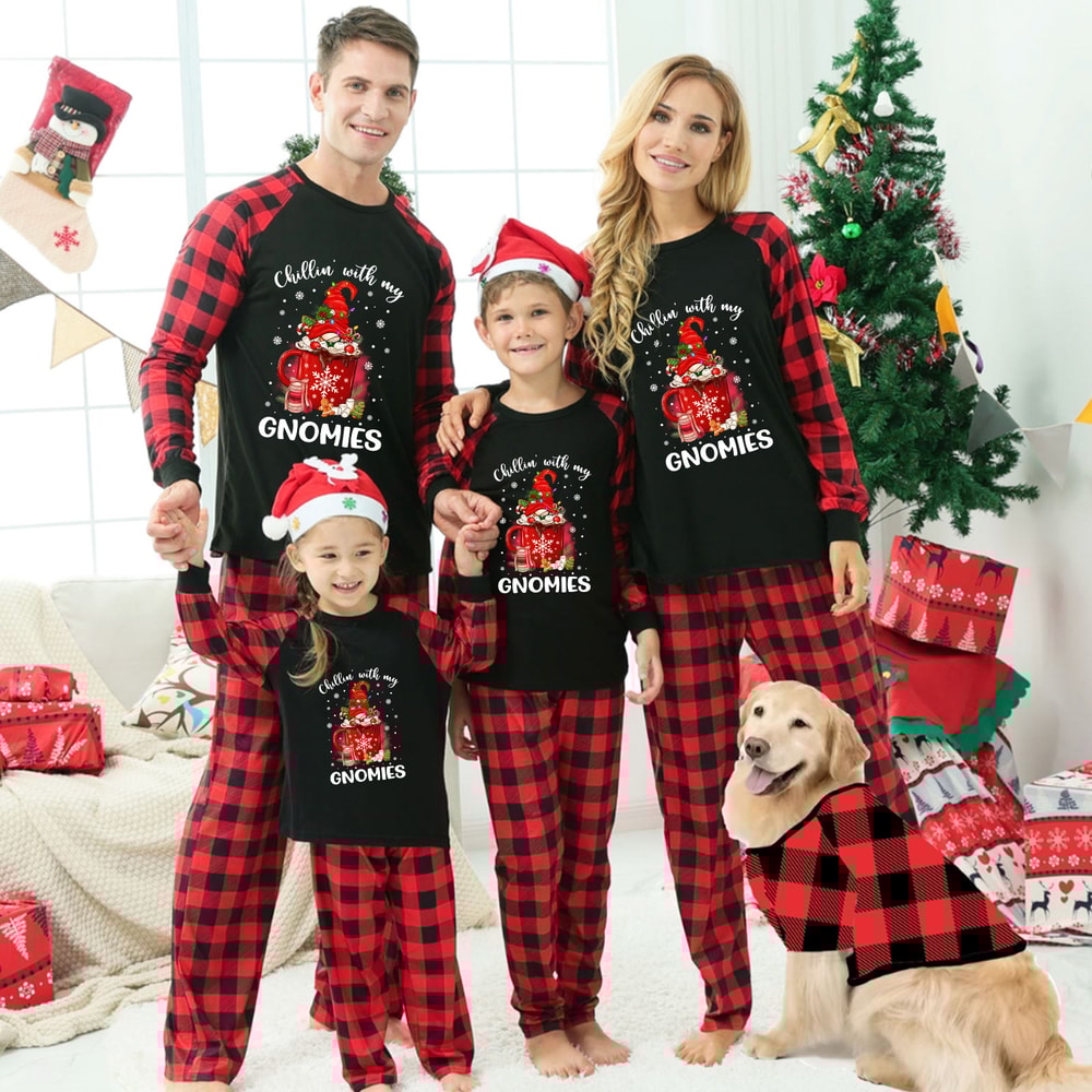 Cozy vibes only! Fun 'Chillin' With My Gnomies' design features adorable red gnomes with hot cocoa mugs & snowflakes on black raglan tops with red buffalo plaid sleeves. Matching red plaid pants complete the look. Poly-blend comfort, elastic waist, 2 side pockets. Sizes for whole family & pets!