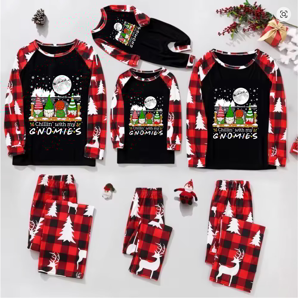 Magical nights ahead! 'Chillin' with my Gnomies' design features colorful gnomes under moonlit sky on black raglan tops with red buffalo plaid sleeves. Matching red plaid pants showcase white reindeer & trees. Poly-blend comfort, elastic waist, 2 side pockets. Sizes for whole family from babies to pets!