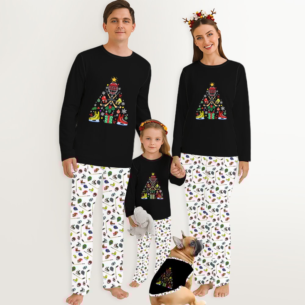 Score style points! Festive Christmas tree made of hockey gear—helmet star, crossed sticks, colorful skates & gifts on black tops. Matching black pants feature all-over hockey equipment print with sticks, helmets & skates. Poly-blend fabric, elastic waistband, 2 side pockets. Sizes for all!