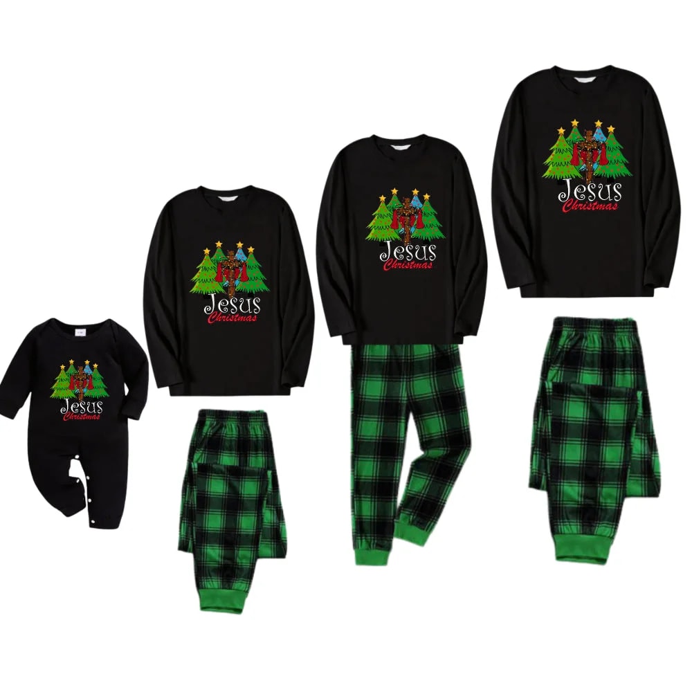 Festive black Jesus Christmas matching pajamas with cozy green plaid pants. Soft, breathable, easy-care fabric for adults, kids, and babies - perfect for holiday photos and Christmas traditions.