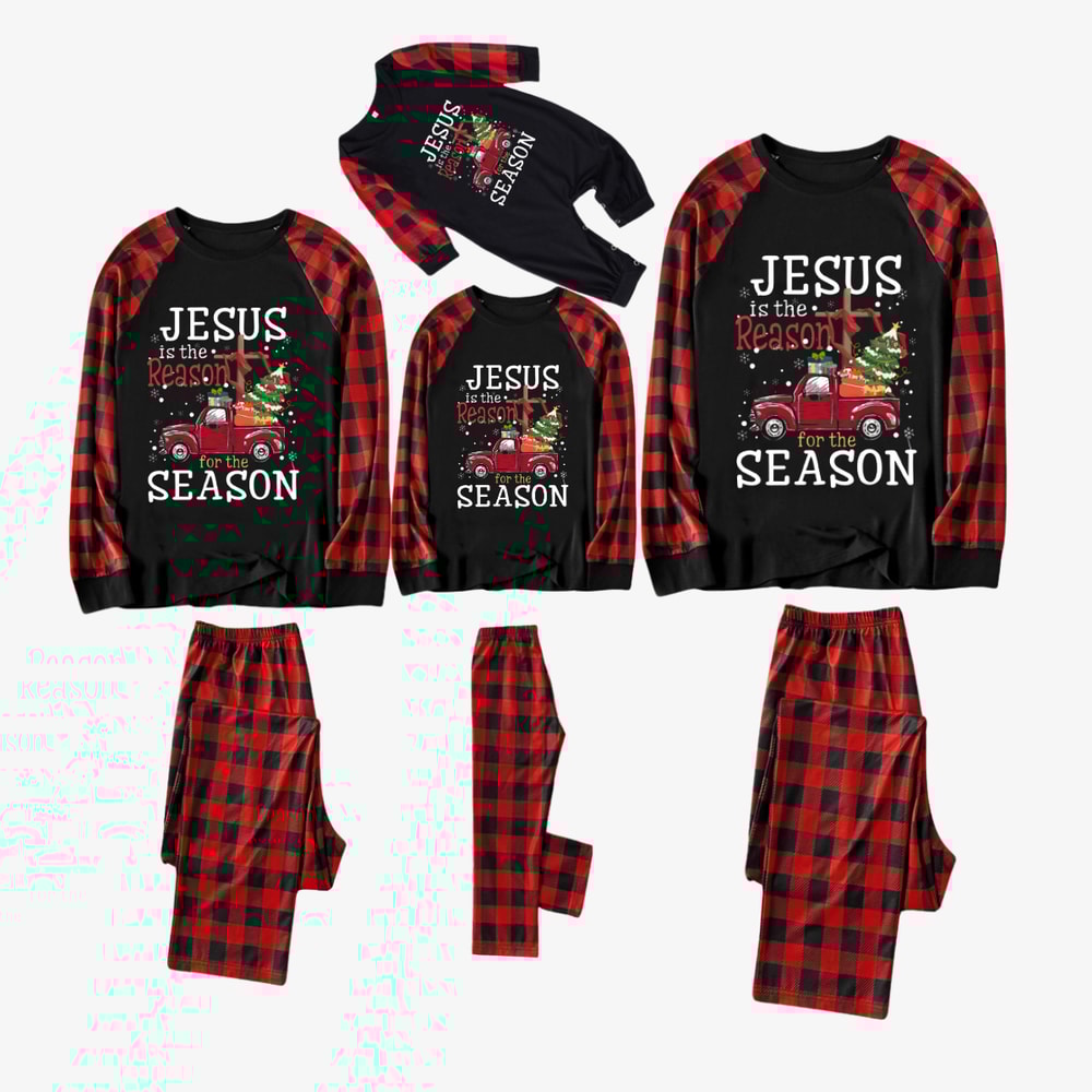 Faith-inspired family holiday pajamas with a festive red truck and “Jesus Is the Reason” design. Soft, breathable fabric with cozy red buffalo plaid pants for adults, kids, and babies.