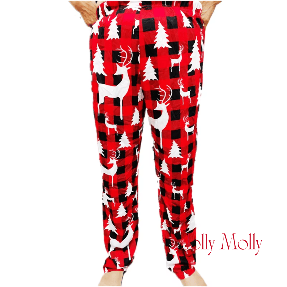 Stay festive with Christmas reindeer red buffalo plaid pajama pants featuring two convenient pockets! Classic red and black plaid with white Christmas trees and reindeer silhouettes. Elastic waistband ensures perfect fit. Ideal for holiday lounging and Christmas sleepwear!