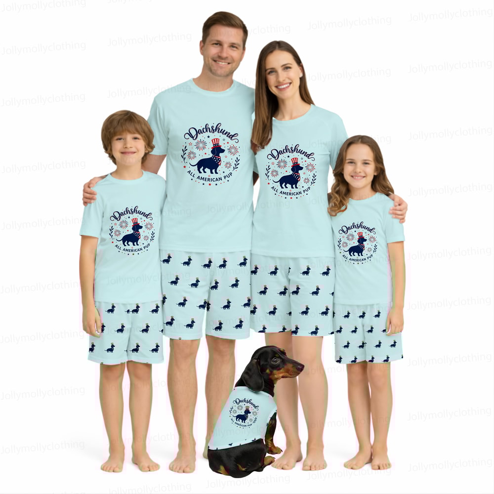 Dachshund All American Pup pajamas for the whole family. Soft poly blend, lightweight and comfy, perfect for summer, 4th of July, and dog lovers.