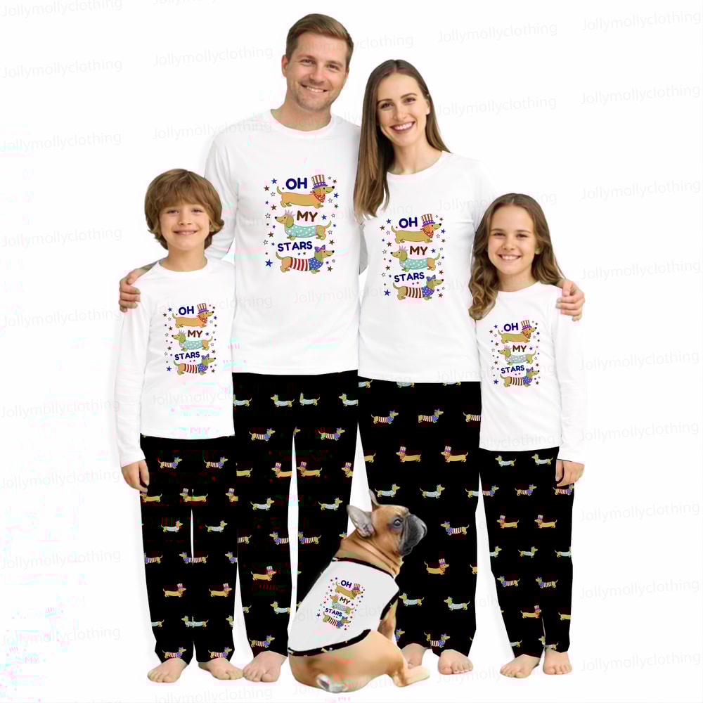 Celebrate in style with Cute Dachshund Family Matching Pajamas. Oh My Stars patriotic design, soft and comfy, perfect for 4th of July and cozy family moments.