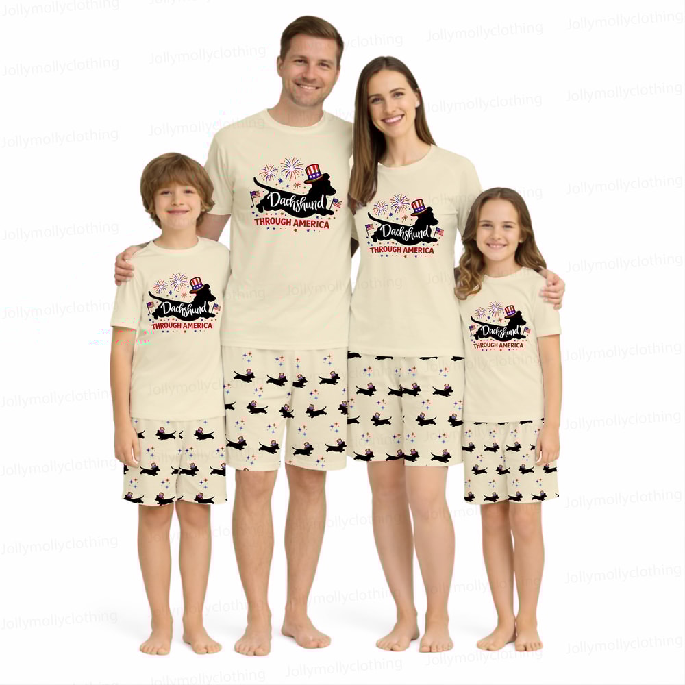 Celebrate in style with Dachshund Through America Family Matching Pajamas. Lightweight short sleeve set with funny patriotic dachshund design, perfect for 4th of July and summer nights.