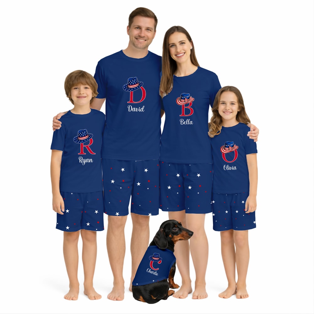 Celebrate in style with custom USA blue family matching pajamas featuring cowboy hat design, side pockets, elastic waistband, soft poly blend, sizes up to 6XL, plus pet options.