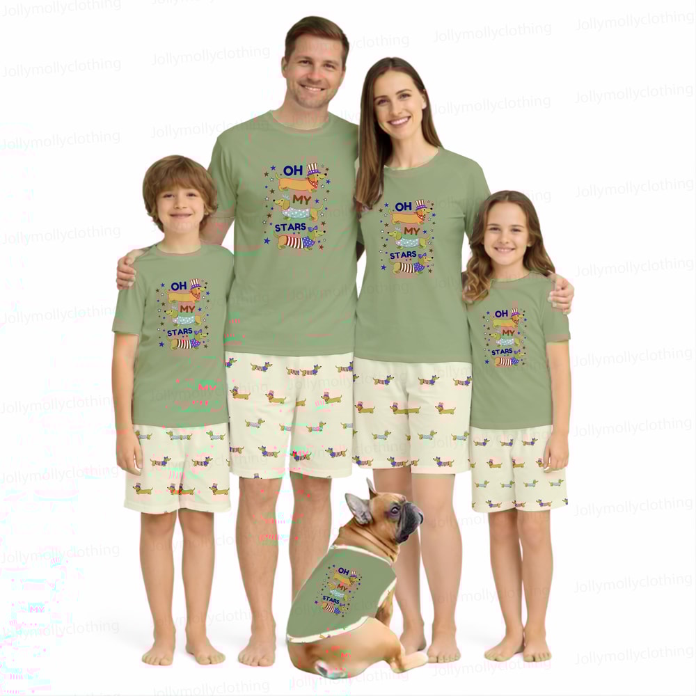 Celebrate in style with 4th of July Oh My Stars Dachshund Family Matching Pajamas. Lightweight green short set, soft and comfy, perfect for summer nights and festive family moments.