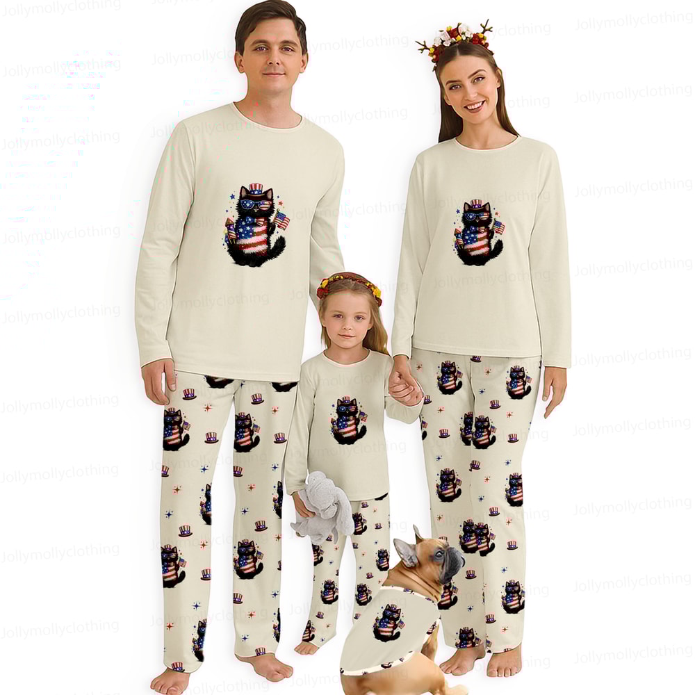 Celebrate in cozy style with Patriotic Black Cat Family Matching Pajamas. Soft long sleeve set with cute USA cat design, perfect for 4th of July, family photos, and comfortable nights.