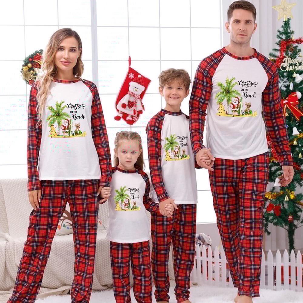 Enjoy a tropical twist on Christmas with matching family pajamas featuring Santa and palm trees, cozy red plaid design, and soft, stretchy holiday comfort.
