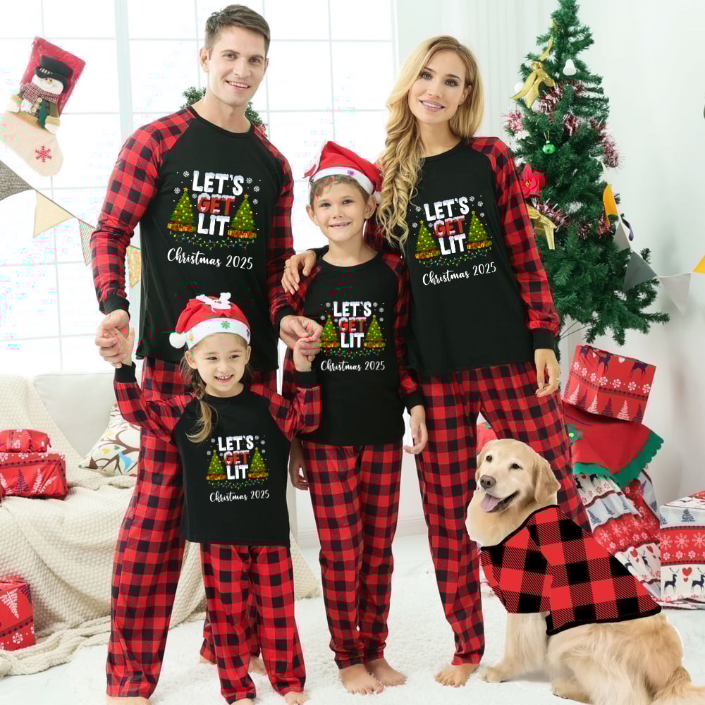 Celebrate Christmas 2025 with fun "Let's Get Lit" family matching pajamas! Features festive Christmas trees with holiday lights design. Black tops with buffalo plaid sleeves and red plaid bottoms. Complete family sizes including baby rompers for holiday memories!