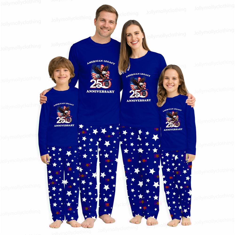 Celebrate in comfort with American Legacy 250th Anniversary Matching Family Pajamas featuring a soft poly blend, crew neck top, wide leg pants, elastic waistband, side pockets, and sizes for family and pets.