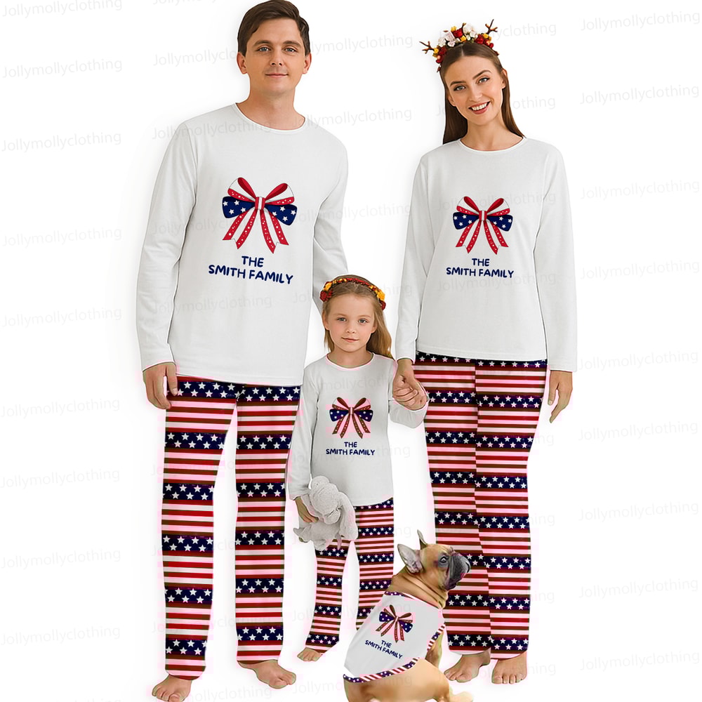 Celebrate in comfort with Personalized Patriotic Bow Matching Family Pajamas featuring a soft poly blend, crew neck top, elastic waistband shorts, side pockets, and custom family name for adults, kids, and pets.